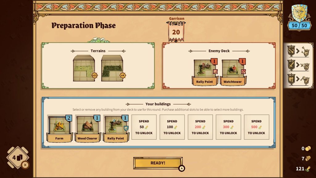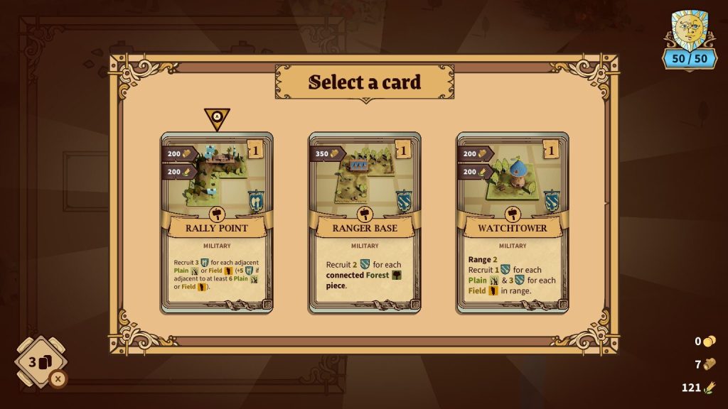 一路上,您将累积新的建筑卡以添加到甲板上。有些人可以帮助您改变周围的地形,通过激活规则收集资源并收集一支战斗力。后者是我遇到的困难。军事建筑取决于相邻地形,互联的土地质量规模等等。