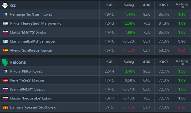 《Dust2》的决胜局十分紧张且势均力敌,但是猎鹰设法控制住他们的勇气。尽管G2的尝试卷土重来并赢得关键的手枪/生态回合,火力强大猎鹰推了过去。摩尼西再次在关键时刻打出高影响力的AWP,瓦解防守并在压力下赢得重要的对决。