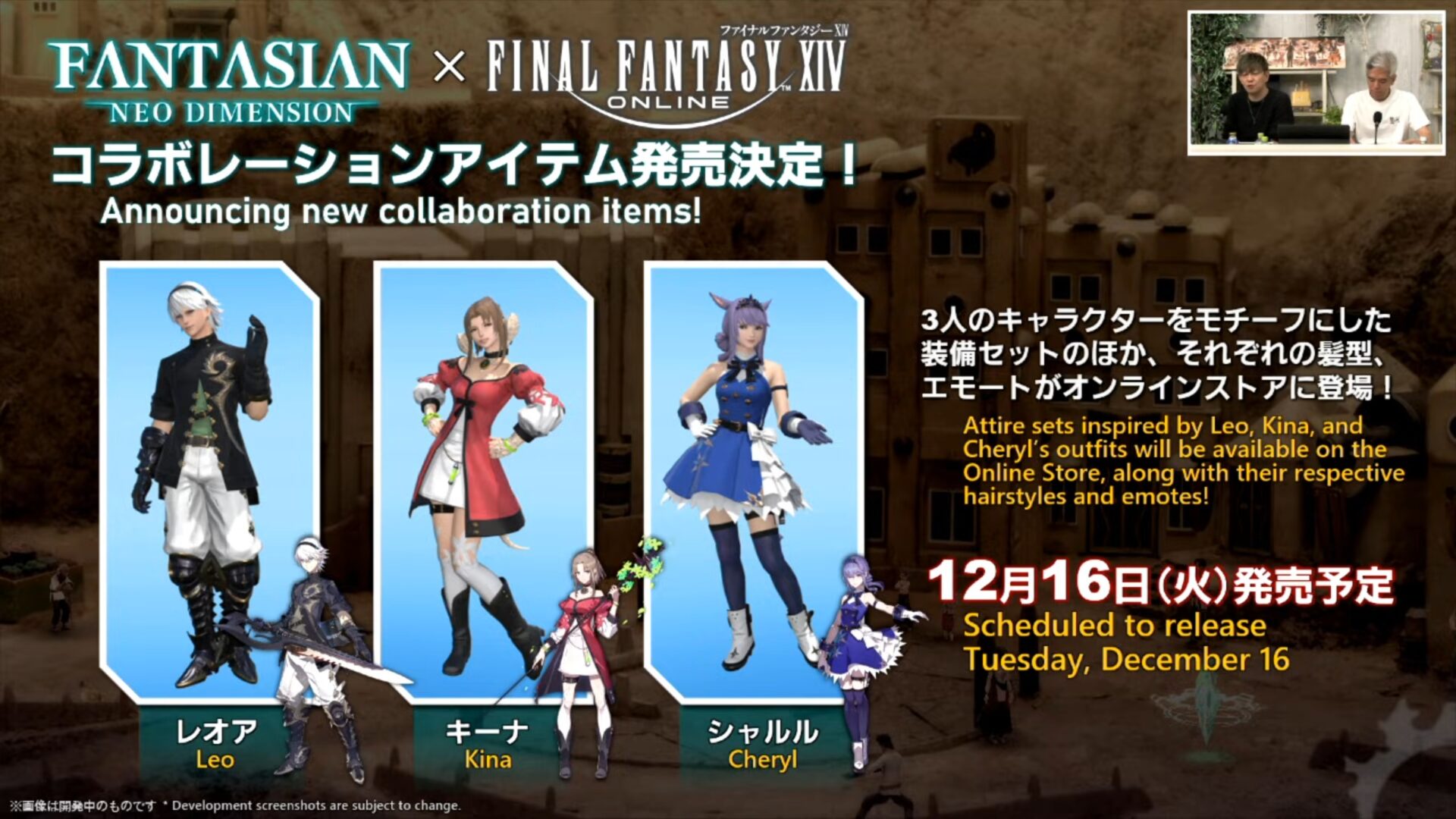 最后,我们还看到了坂口博信描绘《Fanatsian:Neo Dimension》角色的合作服装和发型。它们将于 12 月 16 日在在线商店发布。