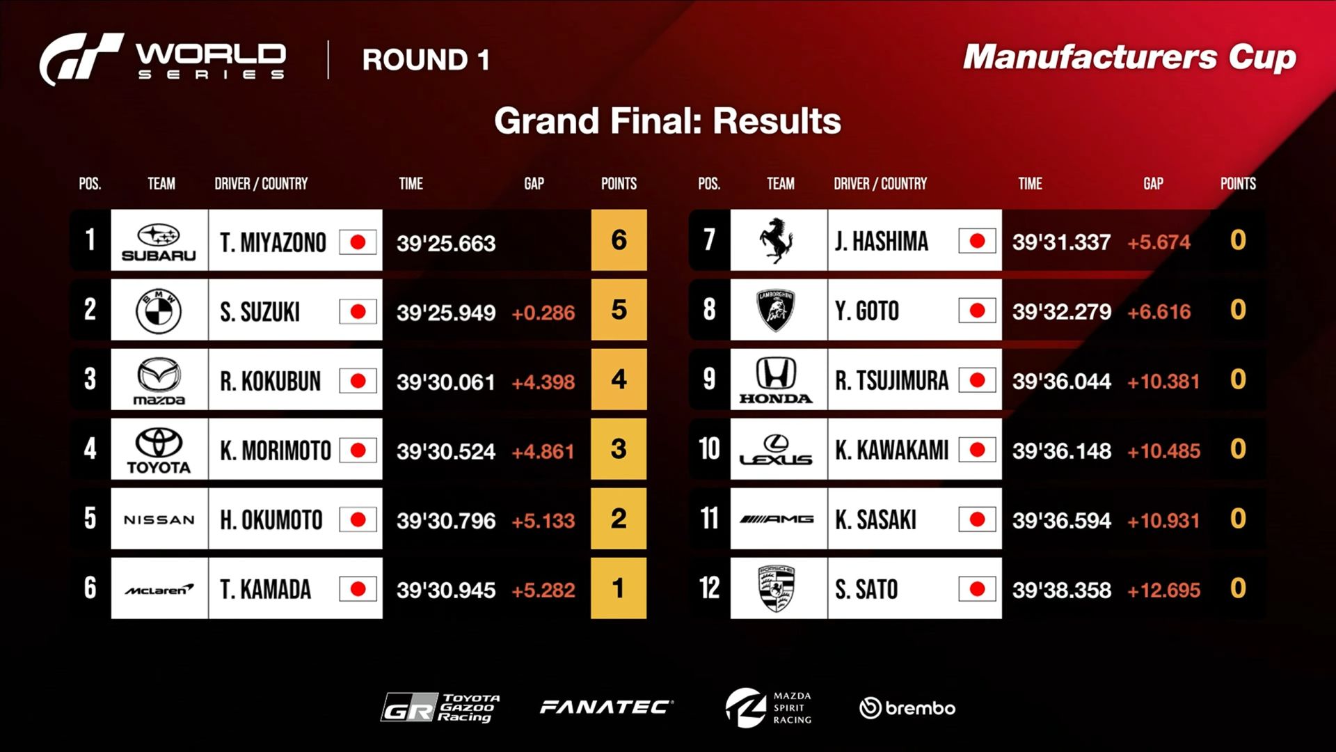 制造商杯看到了一群代表各种顶级汽车品牌的全日赛车手,并看到了去年的国家杯冠军宫田宫(Takuma Miyazono),在讲台上排名最高,代表斯巴鲁。