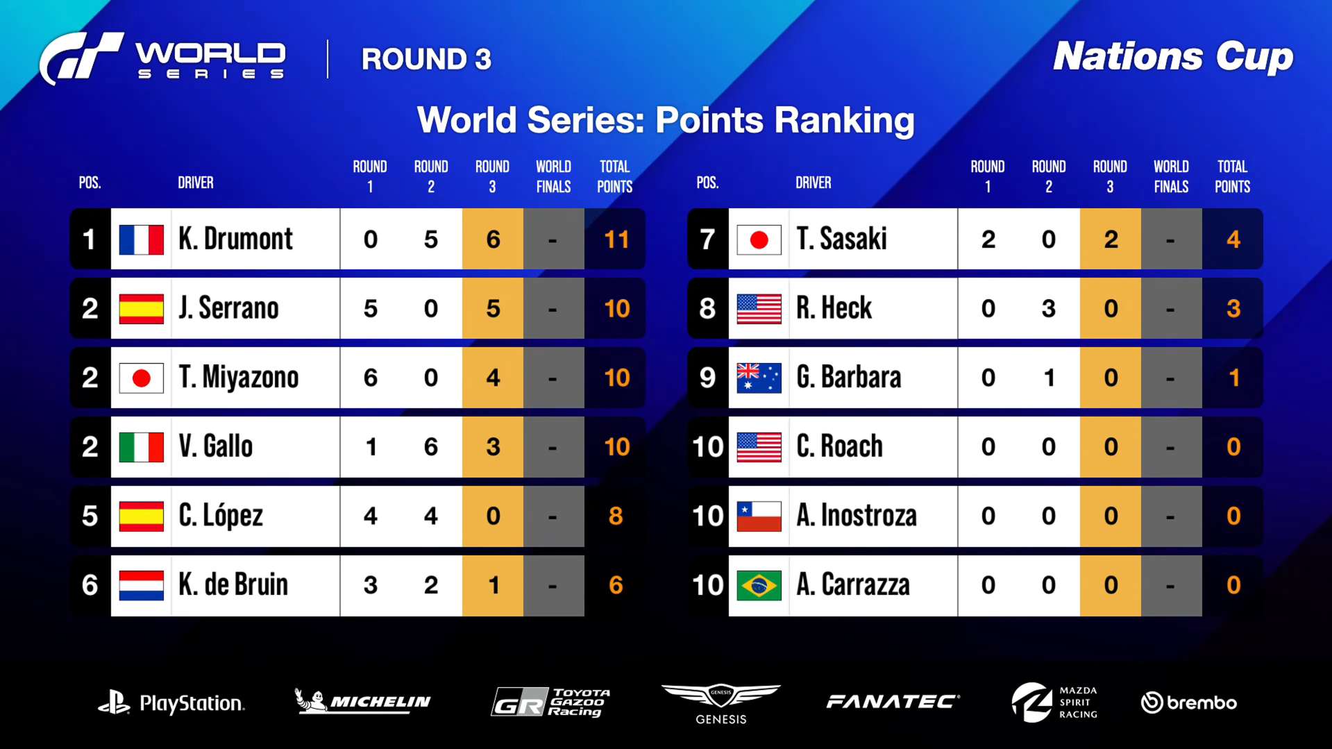 这使杜蒙(Dumont)以11分的优势排在系列赛的顶部,其次是塞拉诺(Serrano),宫诺(Miyazono)和瓦莱里奥·加洛(Valerio Gallo)(他们赢得了前一轮),全部获得10分。
