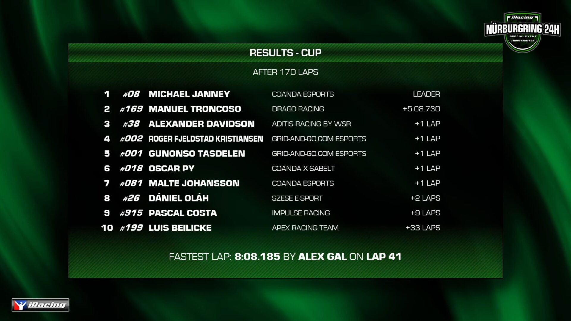 杯赛由#08 Coanda Esports赢得,其次是#169 Drago Racing。