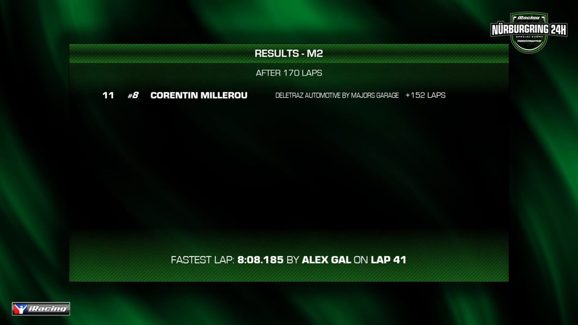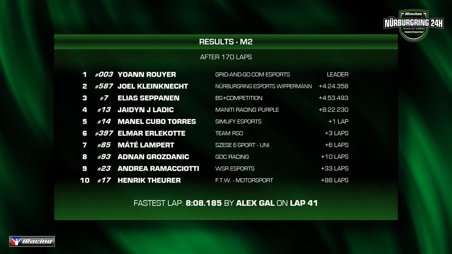 M2级别的胜利是#003 Grid-and-go.com电子竞技,#587NürburgringEsports Wippermann排名第二。