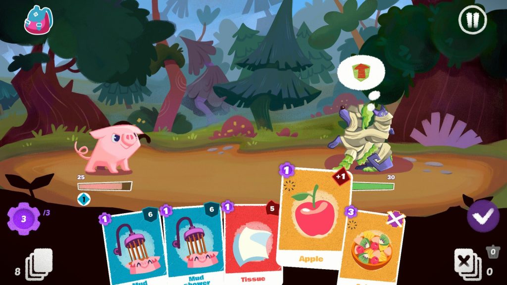 这款游戏以一种奇怪的方式让我想起了小熊维尼的奇思妙想与《喷射战士》类似的东西的奇怪融合。只有在这里,你才试图清理混乱,而不是让事情变得更糟。关于演示,我最喜欢的事情之一是,每次战斗后,Nif Nif 可以选择两张新卡牌中的一张,或者升级他牌组中的现有卡牌。一旦我弄清楚了这一点,我就开始抽出牌组中的所有牌,使它们变得更强,这就是我最终获胜的方式。