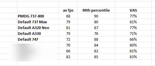 我们还从 PMDG 的 Mathijs Kok 那里得到了一个有趣的、虽然是经验性的性能比较。