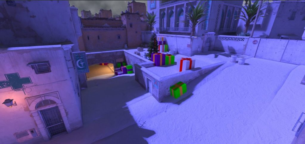 de_Mirage 聖誕版 | WINGMAN 是粉絲製作的 Mirage 聖誕節重新皮膚,專為 CS2 中的 2v2 Wingman 打造。在熟悉的幻影建築之上呈現聖誕節視覺效果:雪、裝飾品、聖誕老人道具等。