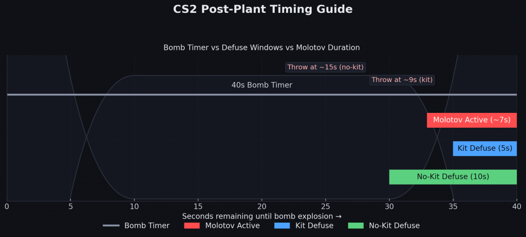 如果您懷疑反恐人員有拆除套件, 扔你的燃燒彈還剩 9 秒在炸彈計時器上。如果沒有套件,您應該將其與還剩 12–14 秒。這確保了他們無法在爆炸前完成拆除工作。