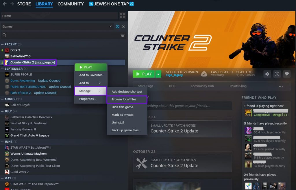 - 尋找CSGO.exe(蒸汽庫→反恐精英2(右鍵單擊)→管理→瀏覽本地文件)