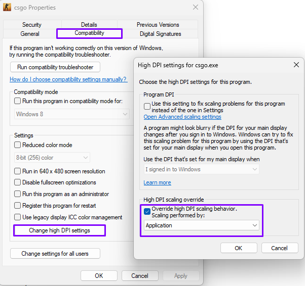 - 點擊更改高 DPI 設置 → 覆蓋高 DPI 縮放行為