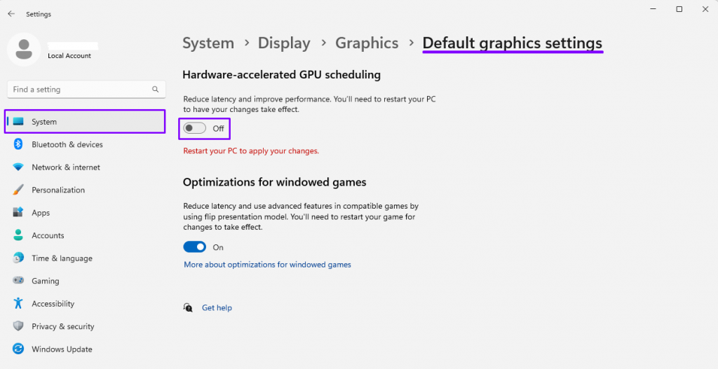 遵循下一個路徑:Windows設定→系統 →展示→圖形→默認圖形設置