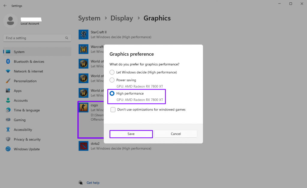 這可確保 Windows 優先考慮 CS2 的 GPU。