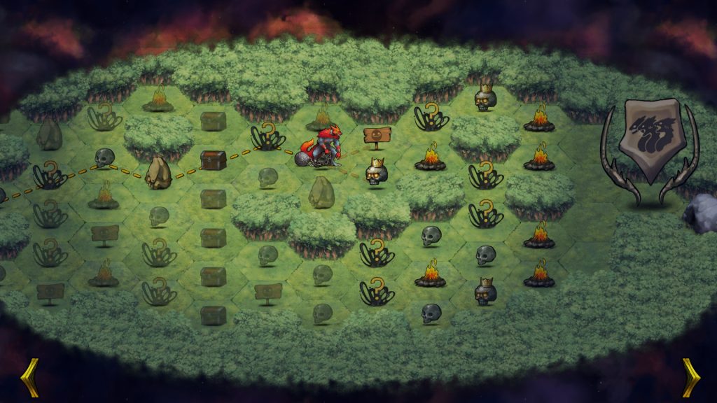 正如該類型的粉絲可能期望的那樣,還有方便的(且有害的)隨機事件和篝火來治愈你的角色和商店。後者不僅由戴著微笑面具的可怕店主經營,而且您還可以在那裡購買一次性捲軸,或付費升級套牌中的卡牌。如果這還不夠,通過實現特定目標,您將解鎖稱為修飾符的東西。這些可能會傷害你,也可能會幫助你跑步,其中之一甚至可能是發現更深層次挑戰的關鍵。
