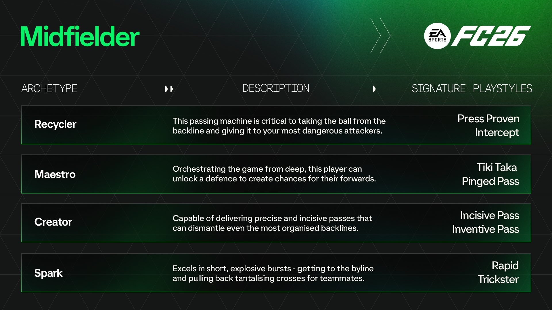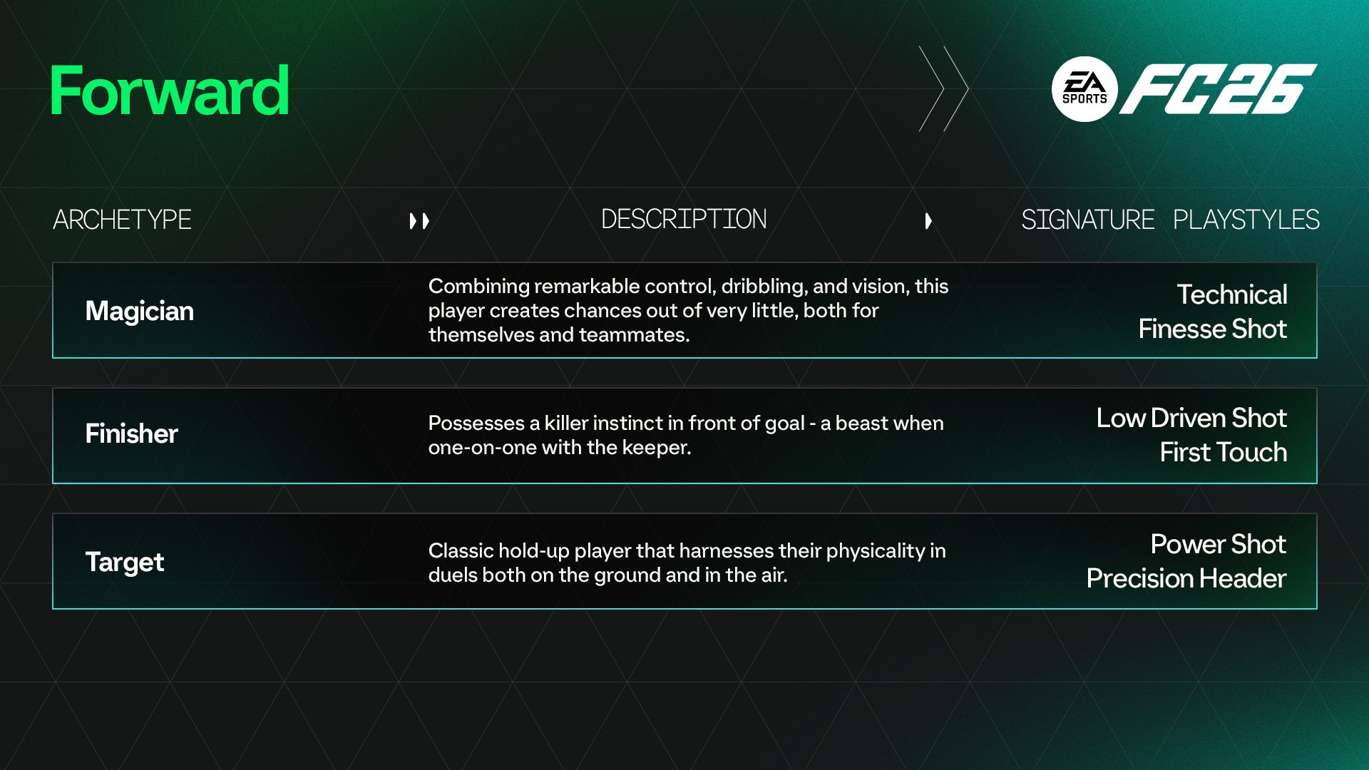 玩家原型在最後一個遊戲揭示中被取笑,他們將在您的職業生涯將如何作為球員和經理髮揮作用。該系統介紹了13種原型,所有這些原型都受到世界足球圖標的啟發,每種原型都為您提供適合您的遊戲風格的選項,尤其是由於被稱為“專業”的子類別。