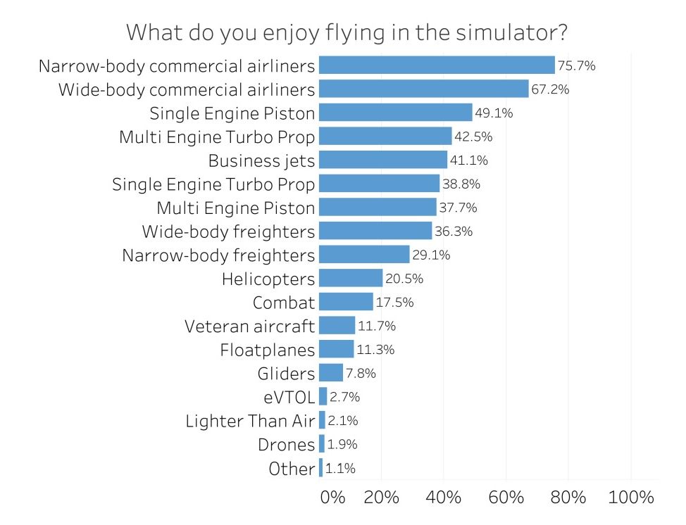 客機是受訪者中最受歡迎的,儘管調查池的重點是核心用戶的重點,但可能至少部分地偏向了該數據點。眾所周知,與通用航空相比,核心沸騰者傾向於商業航空。