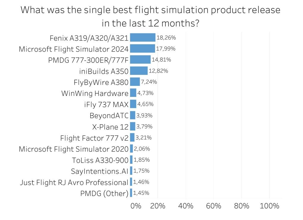 Fenix的空中客車家族被認為是過去12個月發布的最佳飛行模擬產品。有趣的是,儘管上面顯示了結果,但幾乎20%的受訪者認為Microsoft Flight Simulator 2024年度最佳產品,其次是PMDG的三分之一。