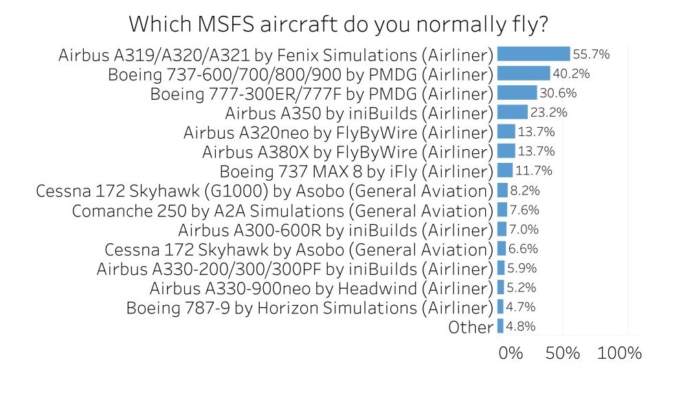 Fenix Simulation的空中客車家族是Microsoft Flight Simulator的最受歡迎的飛機附加機,但PDMG也非常受歡迎,大量受訪者由以波音為重點的開發人員飛行737或777家族。
