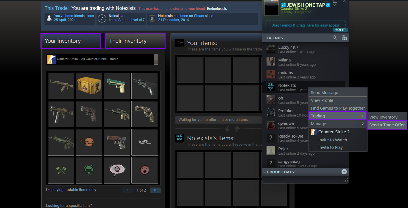 - 您可以通過用戶的Steam配置文件或您的朋友列表來啟動交易。