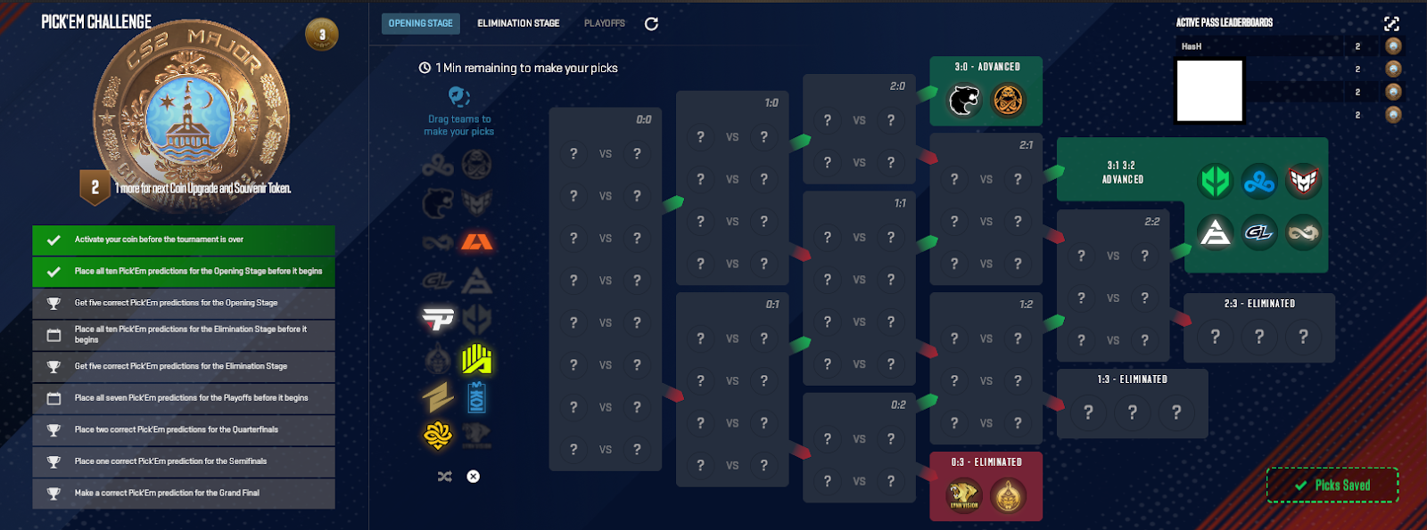 參加CS2大型Pick'EM活動。準確的預測會賺取點,有時獎勵皮膚或紀念品套餐。
