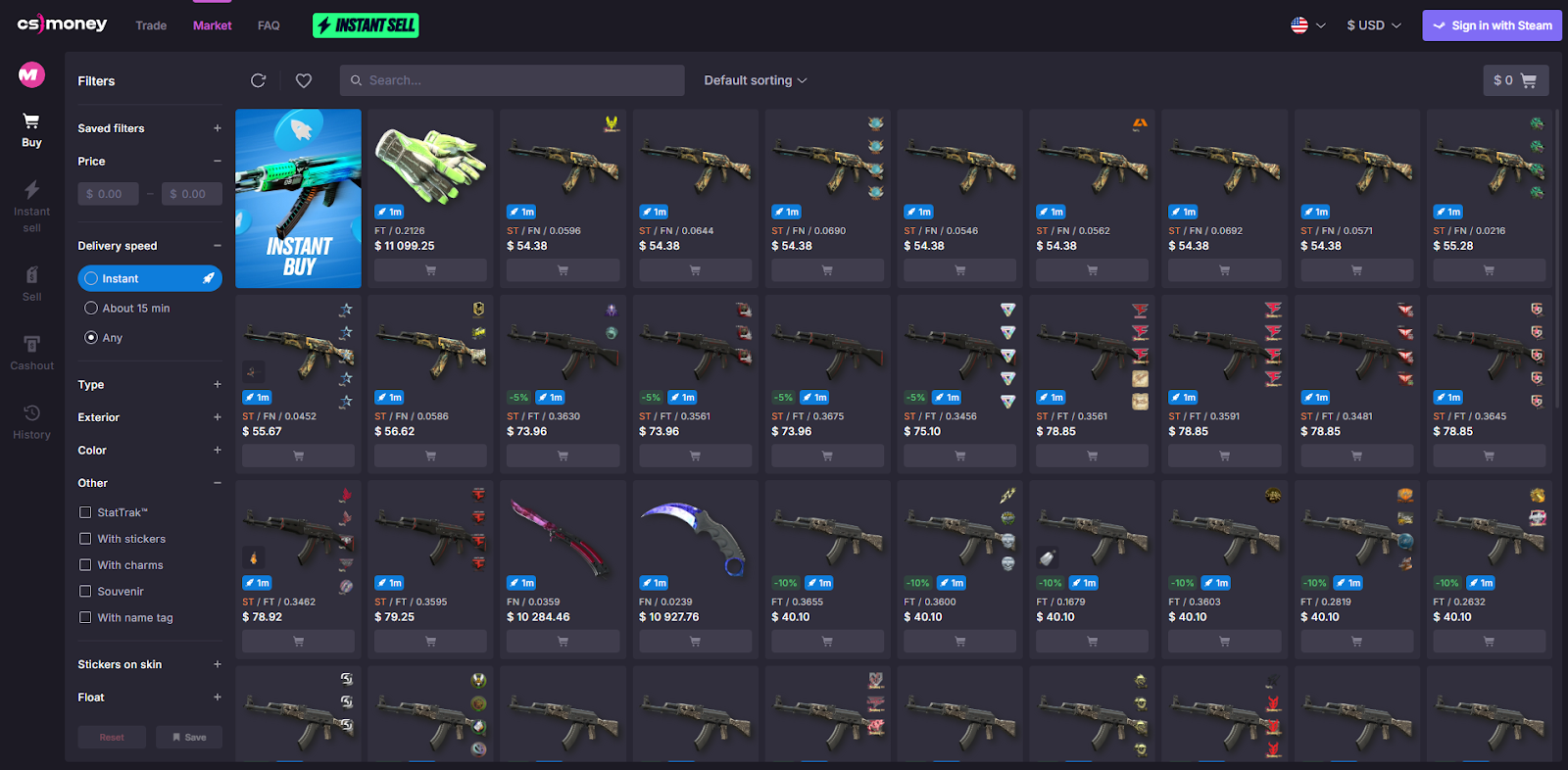 購買皮膚的最安全,最直接的方法。價格更高,但交易是安全和即時的。這蒸汽市場是購買和銷售CS2皮膚的官方市場。它直接集成到您的Steam帳戶中,使其成為最安全,最用戶友好的選項。