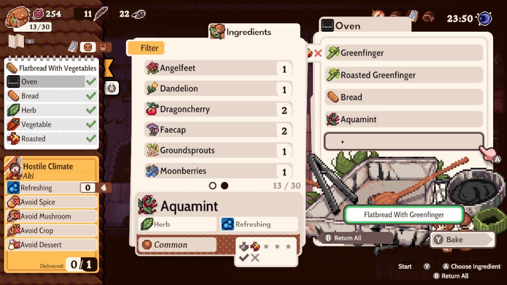 《神奇美味》將重複的平台與未經深思熟慮的原料收集機制結合在一起。雖然如前所述,《Magical Delicacy》有一個花園供玩家種植農作物,但遊戲中只有大約四分之一的食材實際上是可以耕種的。許多非農作物需要玩家購買(再次強調,沒什麼大不了的),但也有一些成分需要在 Grat 周圍手工收集。這不僅令人沮喪,因為一旦找到,除了非常基本的標記系統之外,無法在地圖上永久指示您找到所述成分的位置,而且《Magical Delicacy》的玩家庫存和存儲系統也極其有限——種植農作物和以任何方式儲存稀有成分幾乎是不可能的。