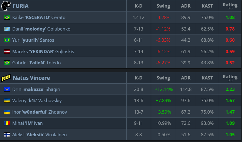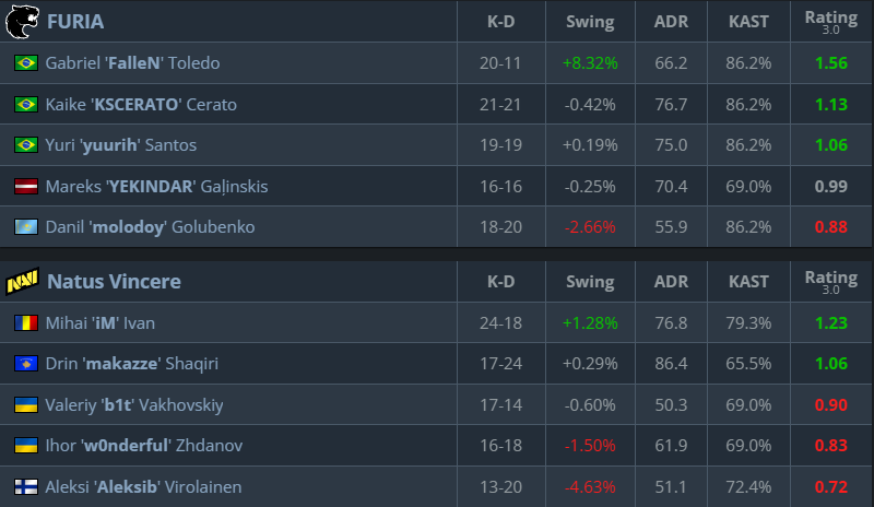 巴西隊上演令人印象深刻的逆轉,將比分拖入加時賽,最終鎖定勝局。16-13獲勝。崩潰迫使第三張地圖出現,並在進入決勝局時堅定地扭轉了勢頭,對 FURIA 有利。