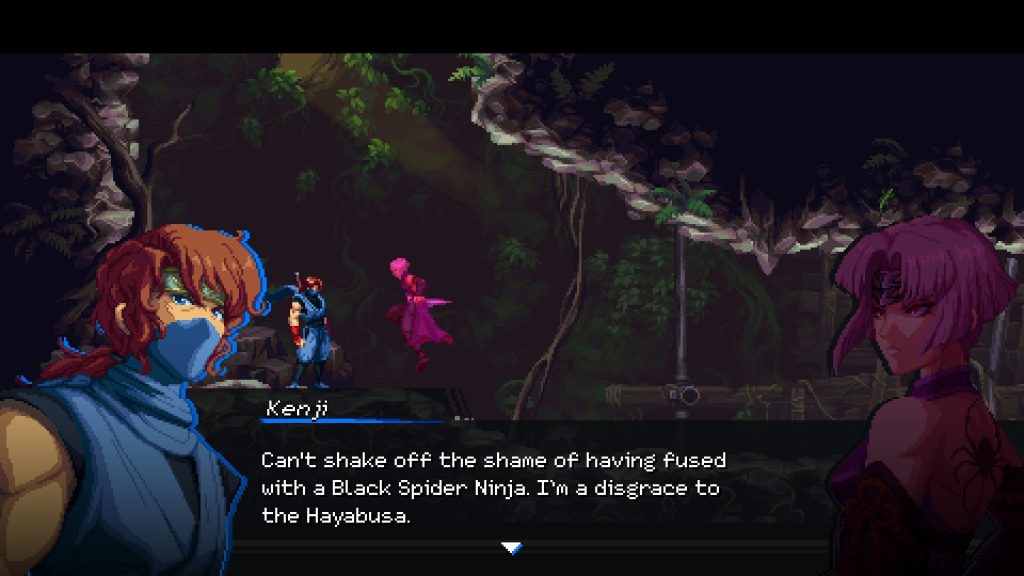 我玩的《Ragebound》演示版精選了一系列關卡,以提供最終體驗的可靠描述。第一關和第二關之間也有不少敘事跳躍,健二突然發現自己被黑蜘蛛氏族忍者久森束縛住了。但這沒關係,它給了我們一些期待。