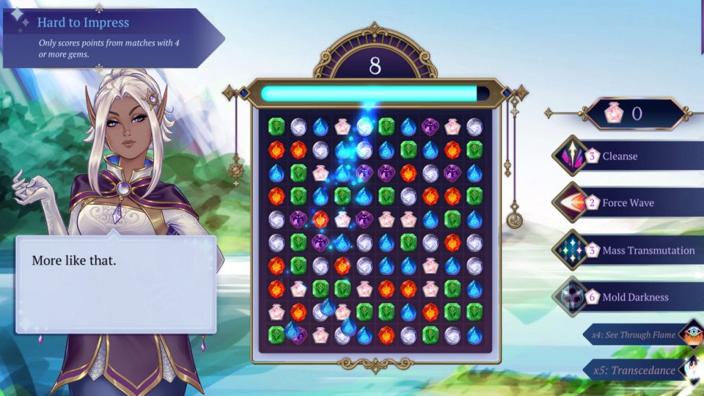 他們保持比賽新鮮的方式是允許您學習不同的咒語來操縱板。此外,要打動角色,您首先必須在董事會上展示自己的技能,並且它們使這一特殊要求更加複雜。前面提到的冰皇后是我的目標,我慘敗,無法吸引她。她只允許我的4個或更多的比賽獲得咒語體驗(需要贏得戰鬥)。加上有限的動作,我無法證明自己的愛。