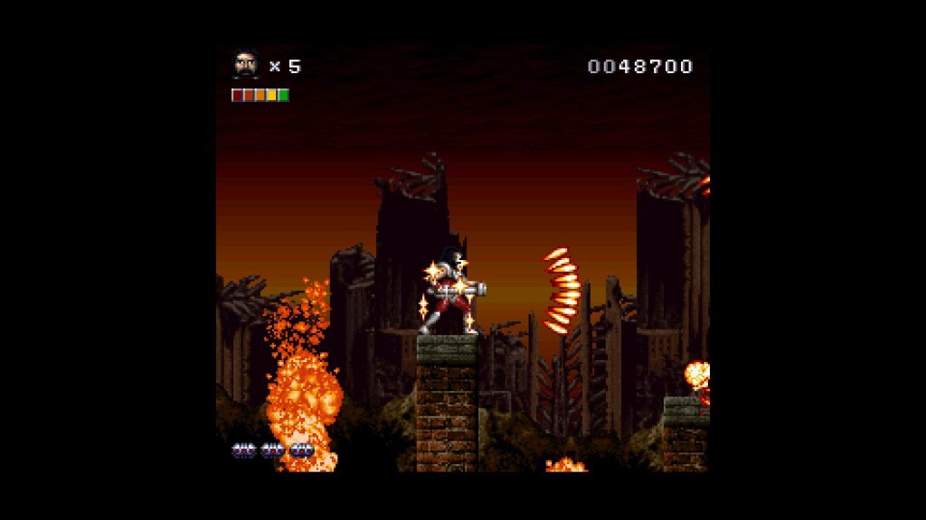 從第一階段開始,我就知道自己面臨著挑戰。即使在跑轟階段,也有大量非常耐用的敵人,其中一些是靜止的,許多是飛來飛去的。你將面臨咆哮的火牆、激光防禦等危險。然後,在 Shmup 階段,遊戲真的很喜歡讓你產生幽閉恐懼症,如果你允許的話,它會用階段幾何壓垮你。有些隕石會碎成碎片,變成巨大的飛艇艦隊,在倒數第二個階段,你必須快速穿過極其狹窄的隧道,這讓我付出了幾條生命的代價才能通過。