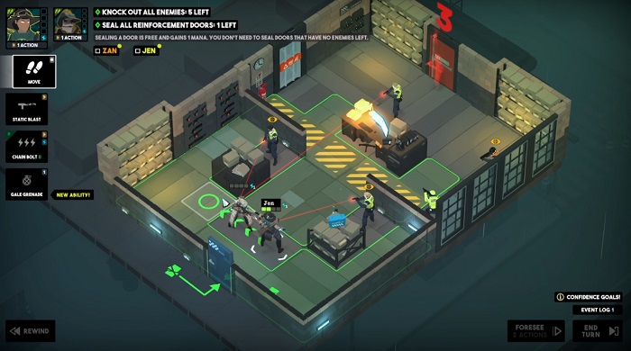 現在你可能想知道實際的遊戲玩法是怎樣的,這很簡單——一切都按其應有的方式進行。說實話,這裡的戰鬥非常乾淨整潔,但我會說我在主要戰役中只玩了大約三個小時,所以我沒有太多機會看到我能把事情搞砸到什麼程度。與策略型遊戲一樣,它是回合製的,並具有一些用於升級你的能力的輕型角色扮演遊戲元素。當你開始一個房間時,你正在為突破做準備,在衝鋒之前將你的角色設置在你想要的位置。一旦你準備好開始大屠殺,你可以在任何時間以任何你想要的順序突破,並發送你認為合適的單位。敵人通常使用激光瞄準器,這樣你就可以知道某人在追趕哪些單位,並且當你在回合中移動時,敵人可以改變他們的首選目標。甚至有些敵人如果你穿過他們的道路,即使輪到你了,他們也會發起攻擊。如果你對行動有點不確定,並且在你完成行動後敵人已經排好隊,你可以使用 Foresee 來查看輪到敵人行動後行動的結果。