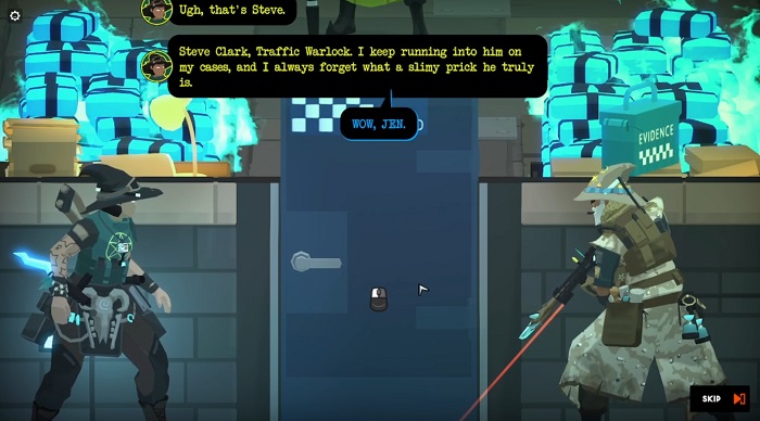 教程結束後,劇情跳轉到六個月後的下一個主角,Jen,一名獨立的 PI 女巫,偶然發現一名醫生向一名德魯伊黑手黨執法者開槍,而這名執法者是唯一有能力向 Jen 的調查工作支付報酬的人。當然,當地警察不太喜歡她插手他們的生意,在受到嚴厲斥責後,她試圖離開,結果發現整個警察局都著火了。原來他們正在遭到突襲,而策劃這場混亂的人不是別人,正是麗芙。除此之外,事實證明贊就在隔壁房間,小毛們認為他是突襲隊的一員,但沒有人相信他是無辜的。幾次破窗之後,珍和讚現在組成了一支隊伍,對抗整個警察部門,同時弄清楚到底發生了什麼。情節從這裡開始變得更加複雜,將大量的毒品、火災和一大堆惡作劇和聰明的胡言亂語拼湊在一起。我不會劇透其他任何東西,但我會誠實地說,角色和世界讓我著迷。