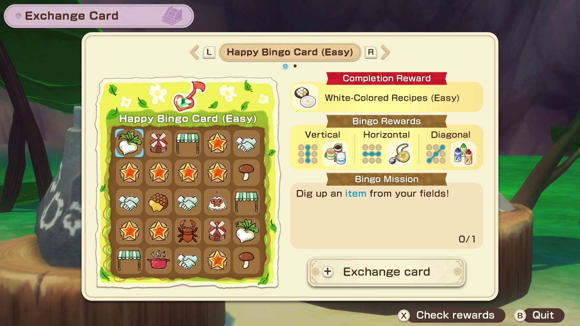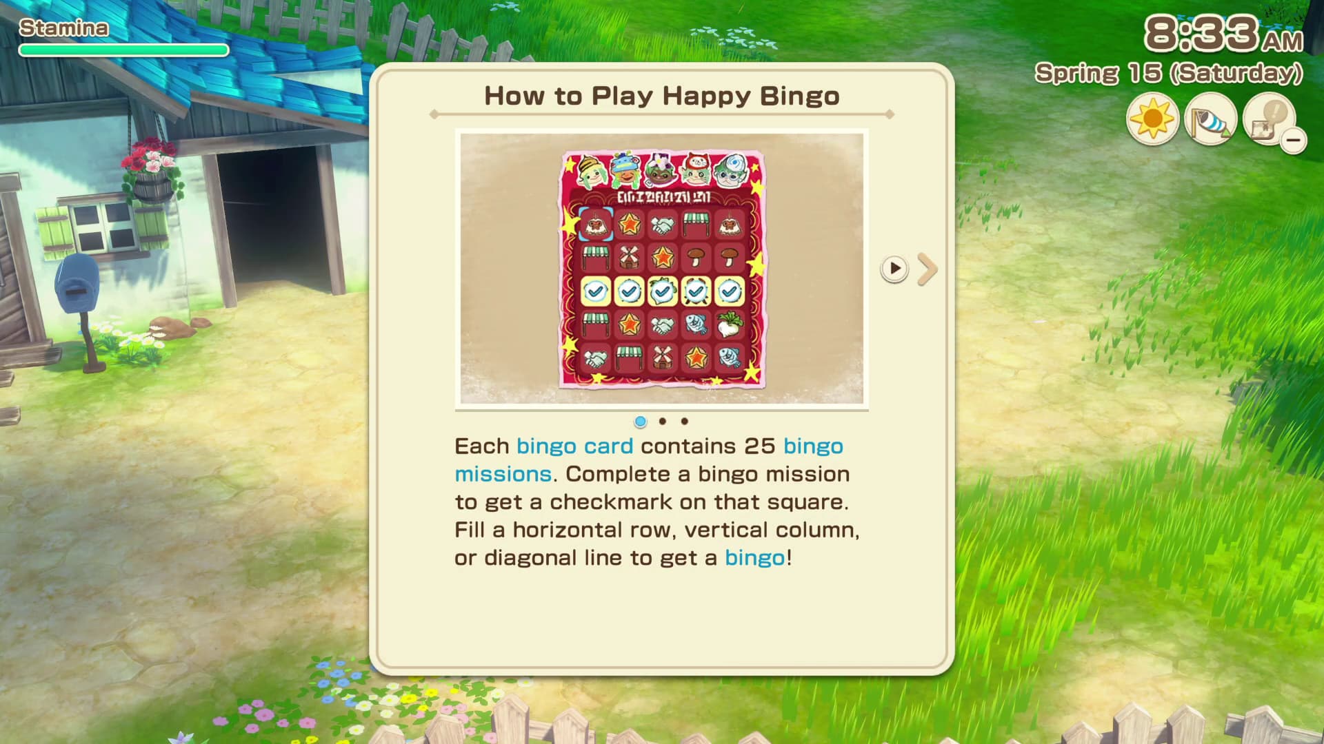 這些賓果卡包括農場和城鎮周圍的不同任務,例如釣魚。例如,第一張快樂賓果卡的任務是撫摸穀倉動物 25 次。