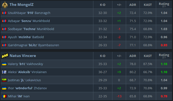 在遇到世界上最好的球隊之前,他們沒有丟失一張地圖活力,在這場比賽中,是'mzinjo',在比賽結束時唯一具有正評級的人。除了這場比賽,那是'910',,,,“閃電戰”和'sinzu'早些時候展示自己的良好表現,如果想進一步進入比賽,他們將不得不露面。以前,他們在季后賽階段比賽時以更糟糕的態度而聞名,但在最近的最大錦標賽中, 奧斯汀少校,他們在賠率上進入了總決賽。它們狀況良好,但是我們還沒有看到他們是否可以出現在季后賽階段。
