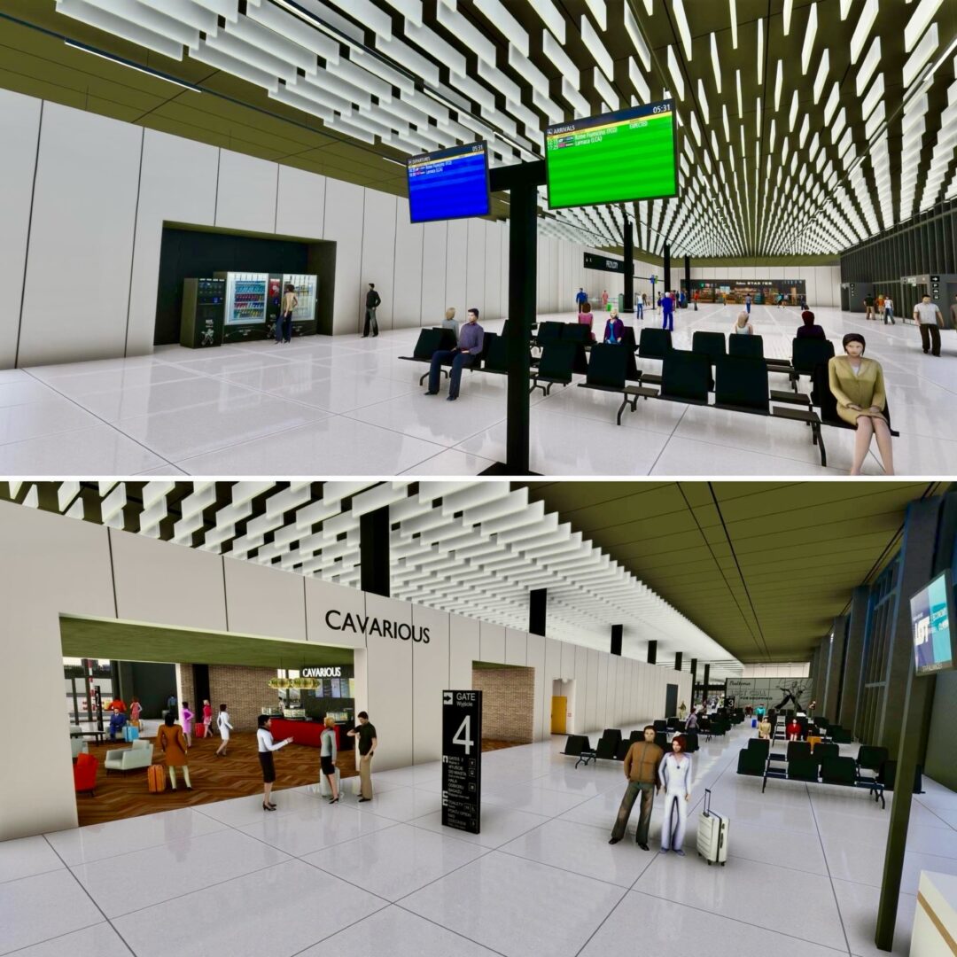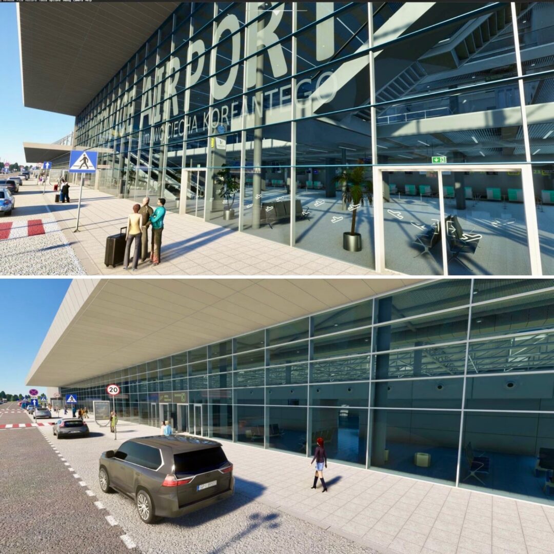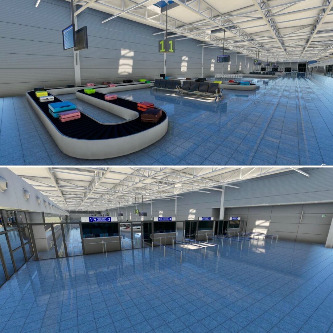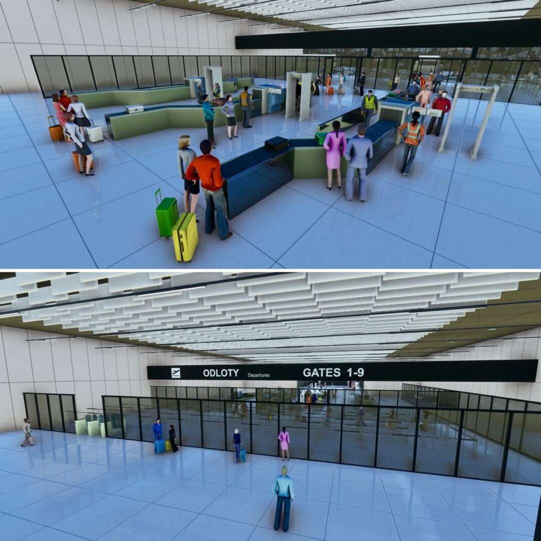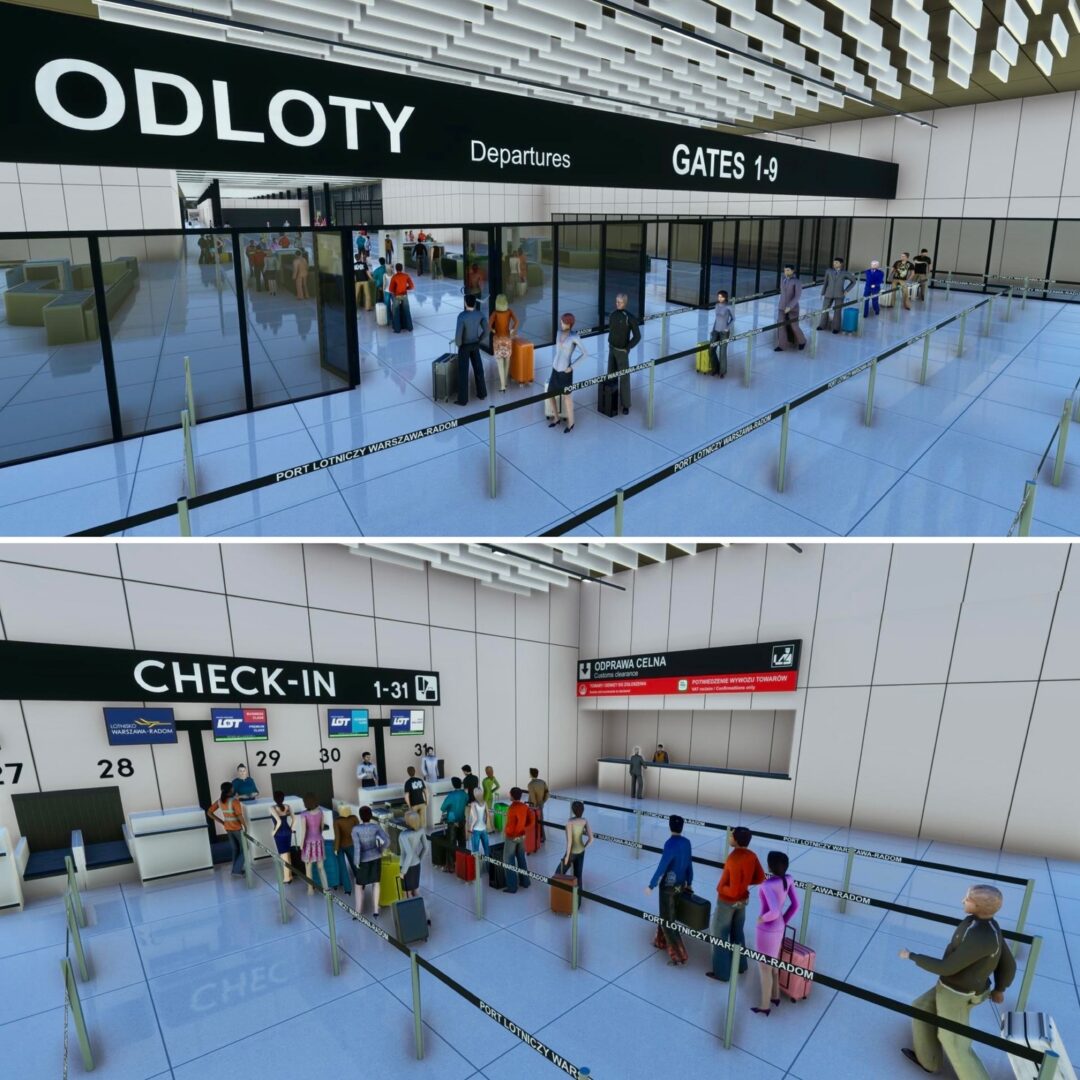 “EPKT 卡托維茲航站樓的內部裝修已接近完成,整個建築中的角色都已佈置完畢。行李帶和自動扶梯的新動畫現已啟用,為航站樓提供了適當的運動感。
