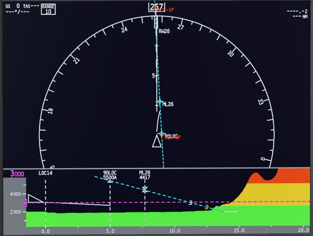 VSD:垂直剖面上的目的地跑道、下滑道和最低高度門以及更清晰的地形圖片