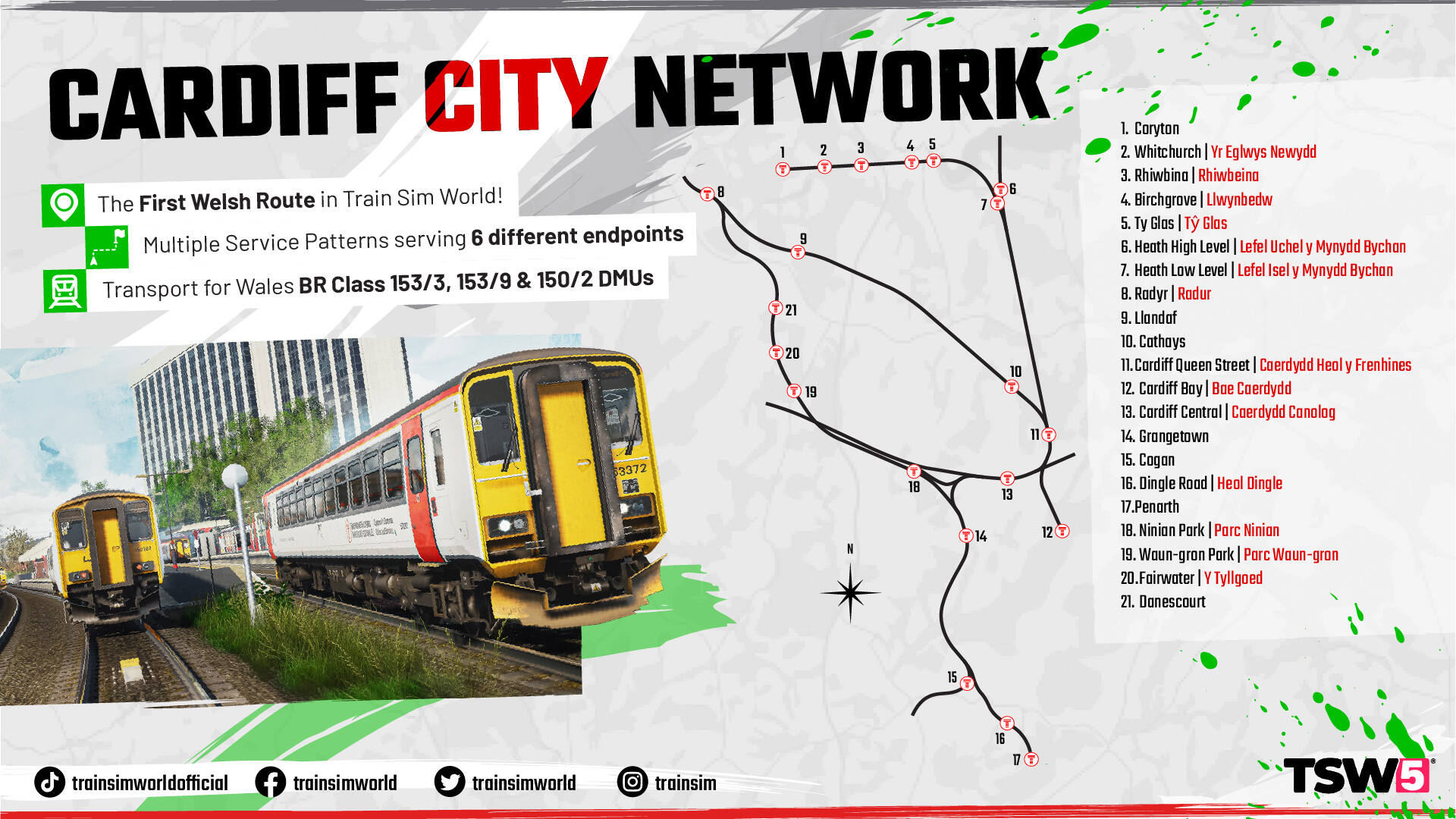卡迪夫城市網絡為《模擬火車世界 5》提供了大量新內容,包括 Canton Depot、兩列新火車以及大約 500 個可玩的服務。這條城市路線擁有六個終點,涵蓋從首都卡迪夫的兩個主要車站:卡迪夫中央車站和卡迪夫皇后街車站出發的線路。