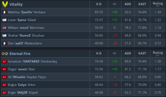 年底,他們進入了四分之一決賽完美世界上海特級並失去了它法澤與一個比分2-1.“斯賓克斯”在這個團隊中扮演了關鍵角色之一,他們引進了'羅普茲',儘管他是世界上最好的球員之一,但他們在長距離比賽中的表現仍然令人懷疑。從他們今年打的兩場比賽我們可以看出‘ZywOo’仍然是這支球隊中最好的球員,並且大部分時間都領先於記分牌。‘ZywOo’如此出色的狀態是一個好兆頭,因為他以自己創造遊戲的能力而聞名。